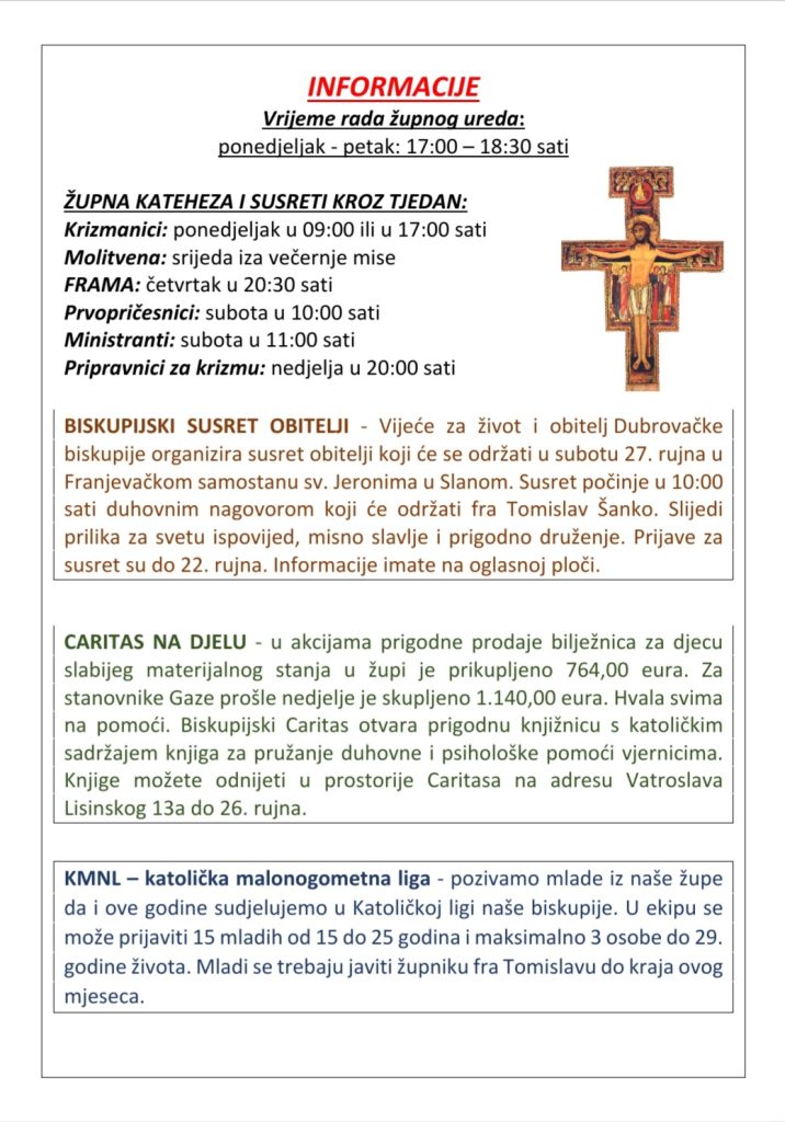 U akcijama prigodne prodaje bilježnica za djecu slabijeg materijalnog stanja u župi je prikupljeno 764, 00 eura. Za stanovnike Gaze prošle nedjelje je skupljeno 1.140,00 eura. Hvala svima na pomoći. Biskupijski Caritas otvara prigodnu knjižnici s katoličkim sadržajem knjiga za pružanje duhovne i psihološke pomoći vjernicima. Knjige možete odnijeti u prostorije Caritasa na adresu Vatroslava Lisinskog 13a do 26. rujna.