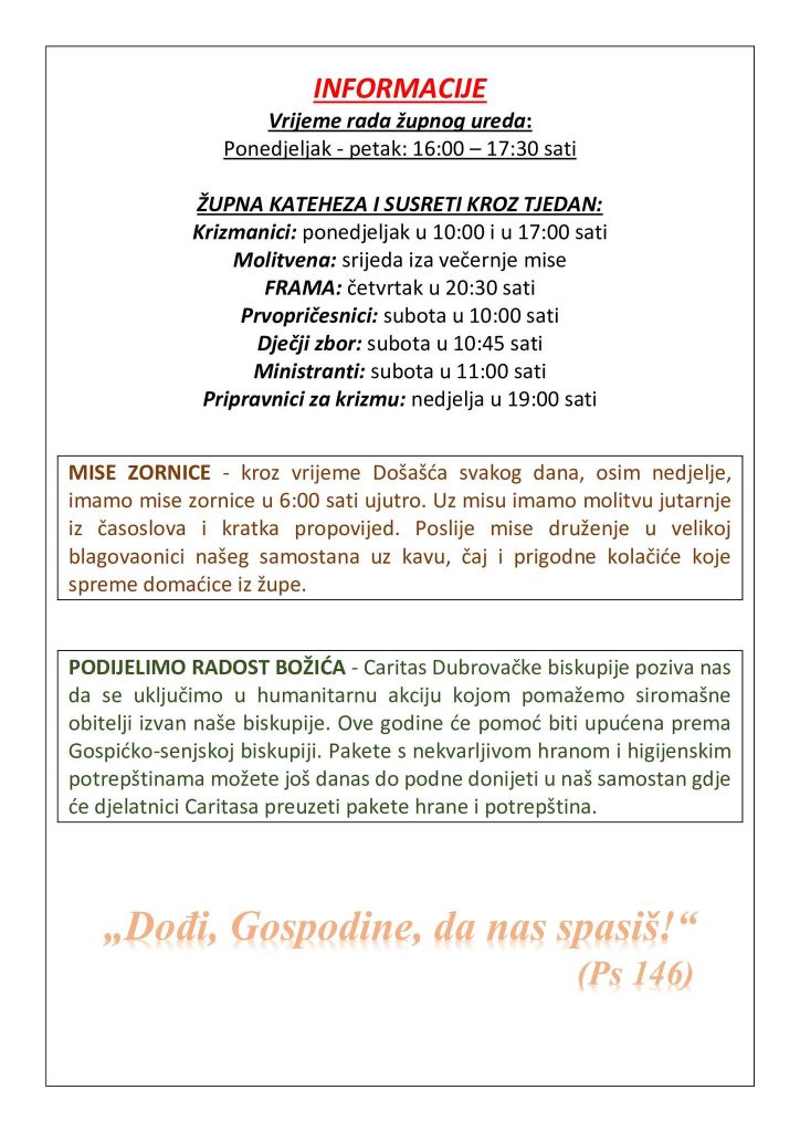 Blagoslov obitelji u našoj župi imamo po redovitom rasporedu nakon svetkovine Božića. Ako u župi ima novih obitelji koje žele blagoslov neka se jave u župni ured ili poslije misa. Raspored blagoslova objavit ćemo iduće nedjelje.