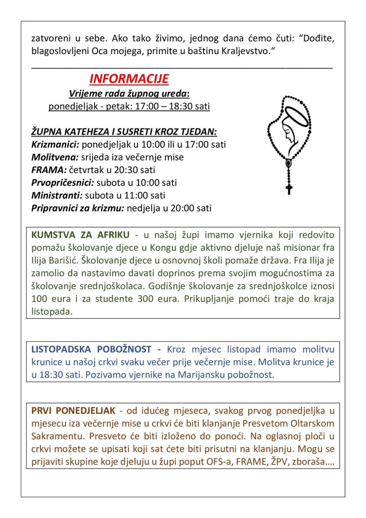 Od idućeg mjeseca, svakog prvog ponedjeljka u mjesecu iza večernje mise u crkvi će biti klanjanje Presvetom Oltarskom Sakramentu. Presveto će biti izloženo do ponoći. Na oglasnoj ploči u crkvi možete se upisati koji sat ćete biti prisutni na klanjanju. Mogu se prijaviti skupine koje djeluju u župi poput OFS-a, FRAME, ŽPV, zboraša….