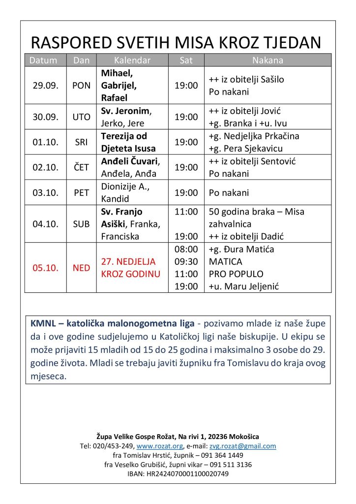 Iduće nedjelje mise su u našoj crkvi u 8,11 i 19 sati. Na Matici je misa u 9:30 sati.