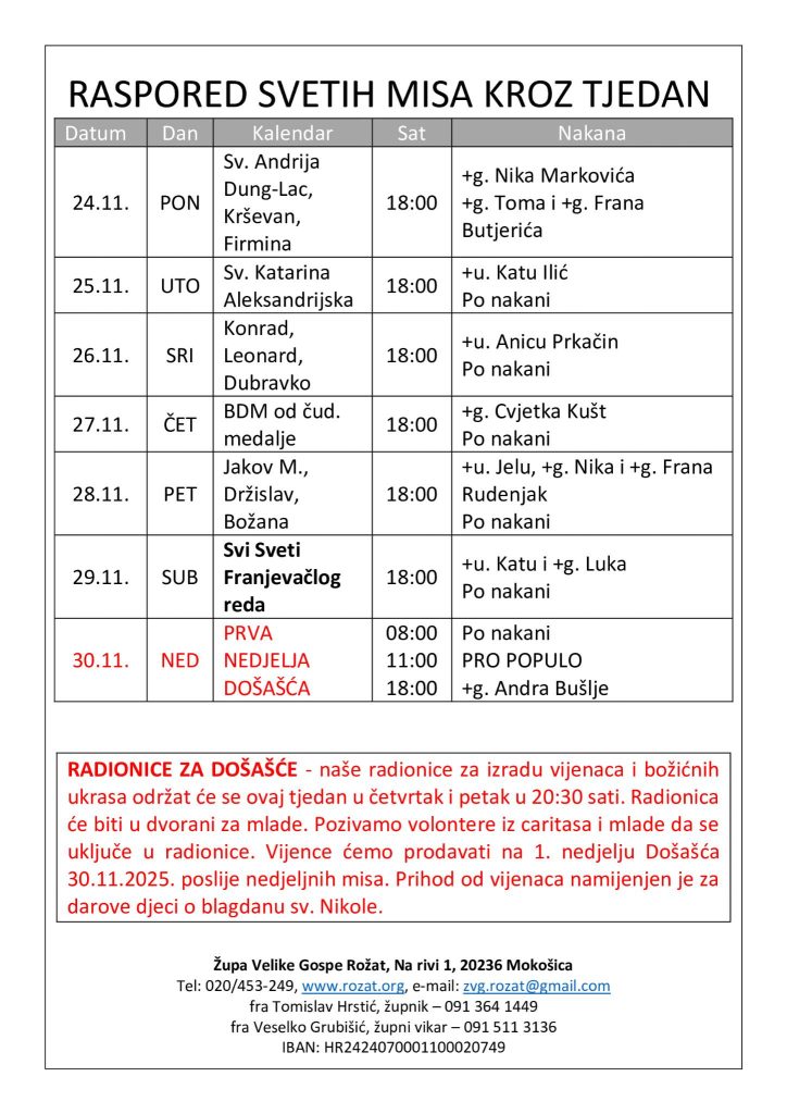 Radionice za izradu vijenaca i božićnih ukrasa održat će se ovaj tjedan u srijedu, četvrtak i petak u 20:30 sati. Pozivamo volontere iz caritasa i mlade da se uključe u radionice. Vijence ćemo prodavati na 1. nedjelju Došašća poslije nedjeljnih misa. Prihod od vijenaca namijenjen je za darove djeci o sv. Nikoli.