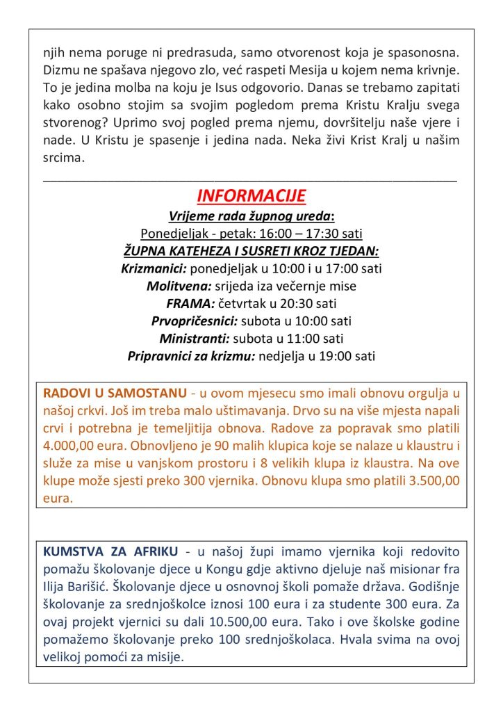 U ovom mjesecu smo imali obnovu orgulja u našoj crkvi: čišćenje i štemanje. Još im treba malo uštimavanja. Radove za popravak smo platili 4.000,00 eura. Obnovljeno je 90 malih klupica koje se nalaze u klaustru i služe za mise u vanjskom prostoru i 8 velikih klupa iz klaustra. Na ove klupe može sjesti oko 300 vjernika. Obnovu klupa smo platili 3.500,00 eura. Svaka pomoć od strane vjernika je dobro došla.
