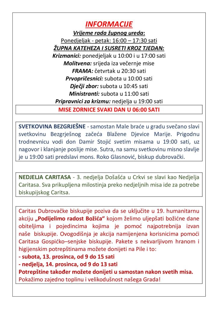 Iduće nedjelje u Crkvi se slavimo Nedjelju Caritasa. Sva prikupljena milostinja preko nedjeljnih misa ide za potrebe biskupijskog Caritsa. Caritas naše biskupije poziva vjernike da se uključe u humanitarnu akciju „Podijelimo radost Božića“ kojima želimo uljepšati božićne blagdane obiteljima kojima je pomoć najpotrebnija u Gospićko – senjskoj biskupiji. Pakete s nekvarljivom hranom i higijenske potrebštine možete donijeti u naš samostan u subotu i nedjelju do 12 sati. Hvala svima na pomoći.